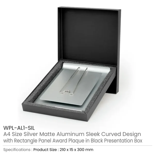 Elegant A4-sized aluminum award plaque with an elevated A5 front panel and built-in stand. Ideal for recognition events, it offers a premium finish and supports sublimation and UV DTF printing. Packaged in a black hard box with foam insert for a classy presentation.