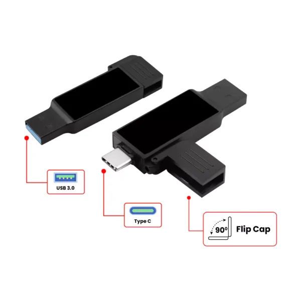 The Black OTG USB 32GB V.3.0 Type C features high-speed data transfer, On-The-Go functionality for direct smartphone connections, and a stylish light-up LED logo. Compact and portable, it’s perfect for easily transferring files between devices.
