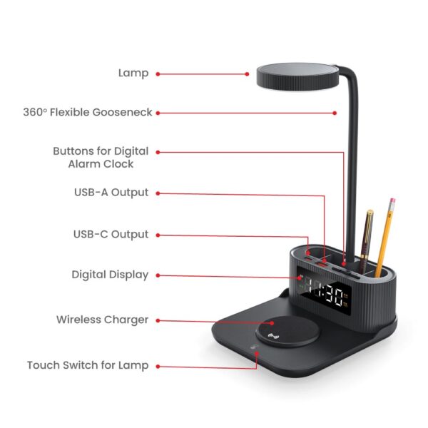Desk Lamp with 15 Wireless Charger, Clock, and Pen Holder