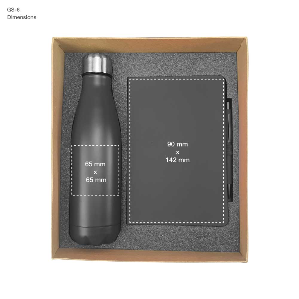 - TM-009: 500ml Stainless Steel Travel Bottle | MB-05: A5 size PU Notebook | PN42: Metal Pen with Stylus.