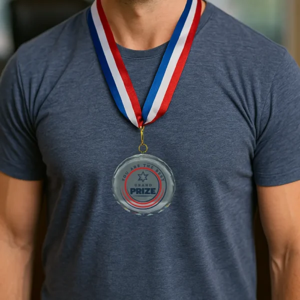 A high-quality 8 cm glass medal, customizable with UV printing or laser engraving, supplied with a branded ribbon and a presentation box.