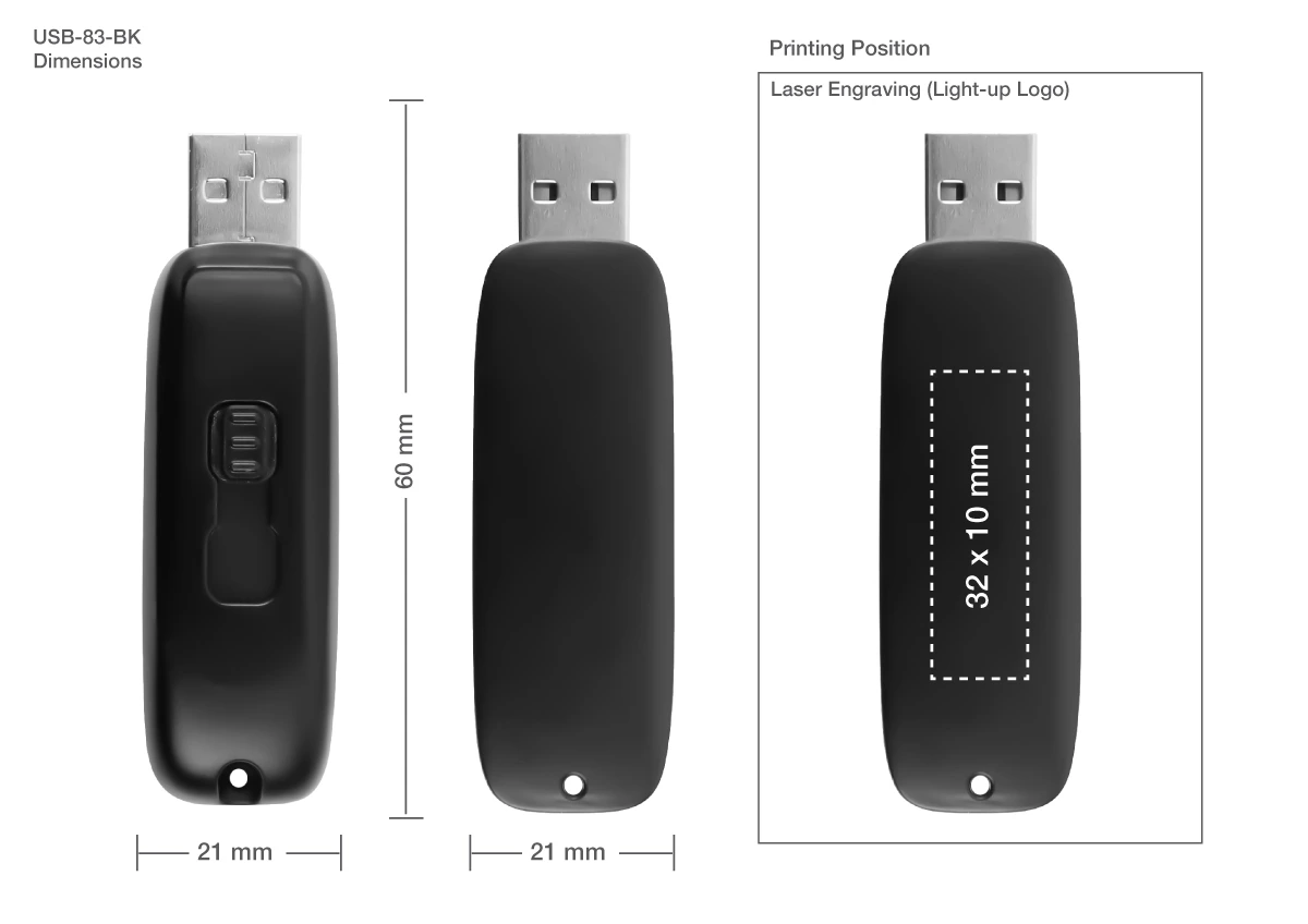 The Light-Up LED Logo USB with Slide Button 64GB V. 3.0 is a functional and trendy choice for those looking for a reliable and fast USB drive with a unique, customizable look. It’s perfect for personal use, tech enthusiasts, or businesses wanting to stand out with a flash drive that offers both style and performance.