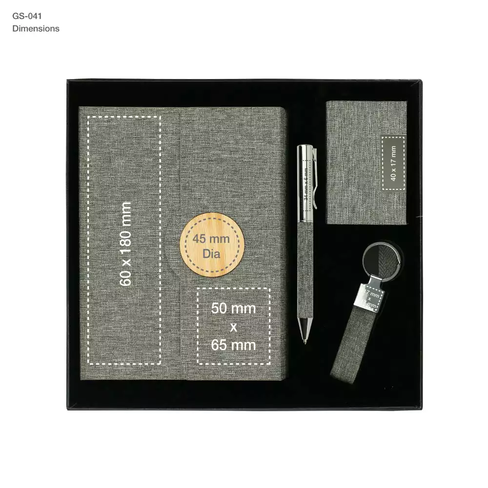Promotional Gift Sets GS-041: Contains 4 products as listed below. Grey fabric cover with black base cardboard gift box with cushion inside for product protection and presentation.