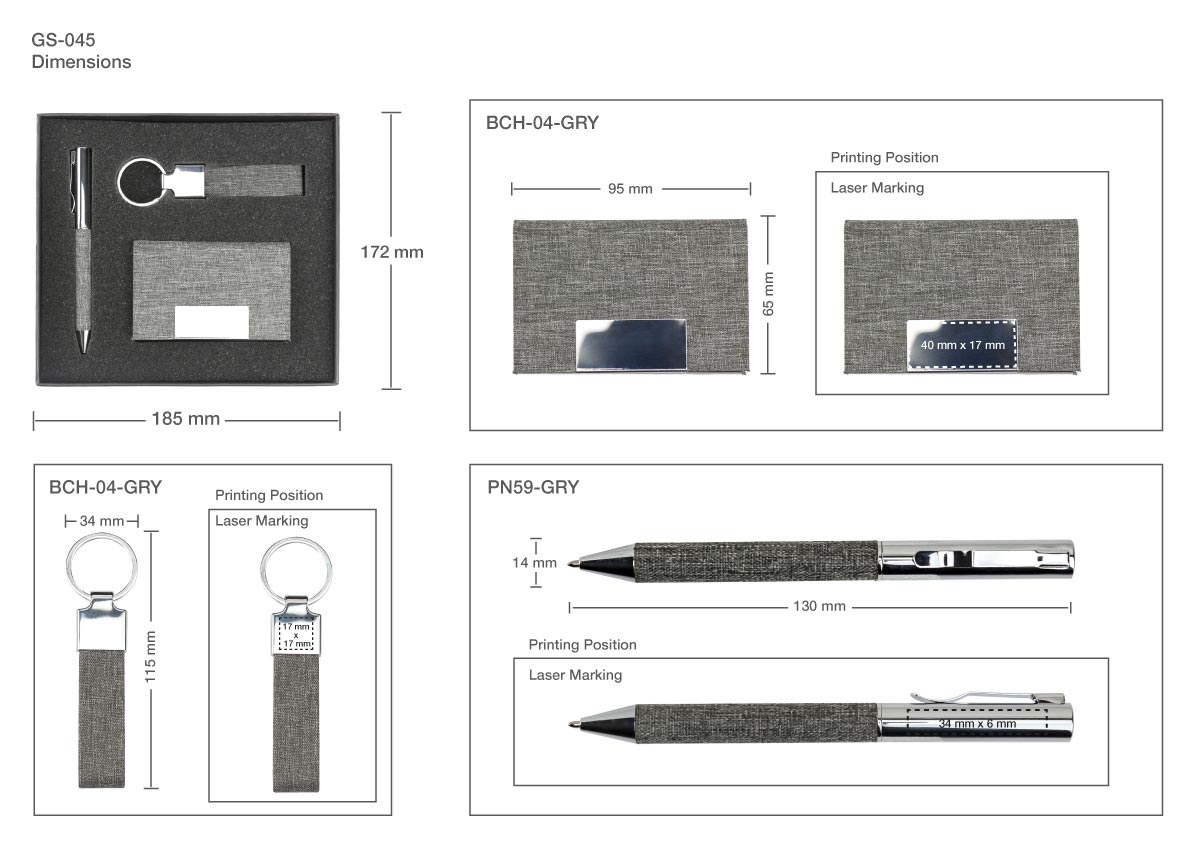 1. RPET Fabric Business Card Holder (SKU: BCH-04-GRY) | 2. Metal Keychain with RPET Fabric | 3. RPET Metal Ball Pens, Twist Action Mechanism, Blue Ink (SKU: PN59-GRY)