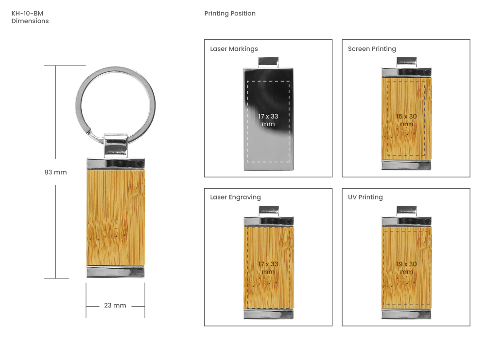 Rectangular bamboo and metal keychains, metal in shiny nickel, front side with bamboo plate, with 32mm shiny nickel flat ring.