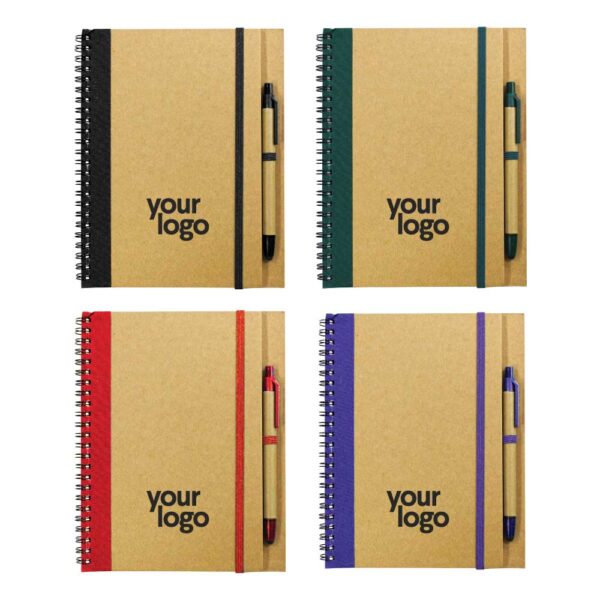 A recycled notebook with a pen comprises a pen, a pen loop, and an elastic band. Thus, these notebooks are used for multiple purposes. You can use it as a notepad, a pen holder, and an accessory holder. The cover of this notebook is made of 100% recycled and eco-friendly cardboard material. Thus, it makes this cover hard. This cover is light brown with a black spiral ring. However, it comprises a colorful elastic strap and pen loop. The pen had also crafted from cardboard material. It has a cardboard barrel with a colorful tip and clip. Thus, it’s a perfect promotional gift. You can also use these promotional notebooks for giveaways.