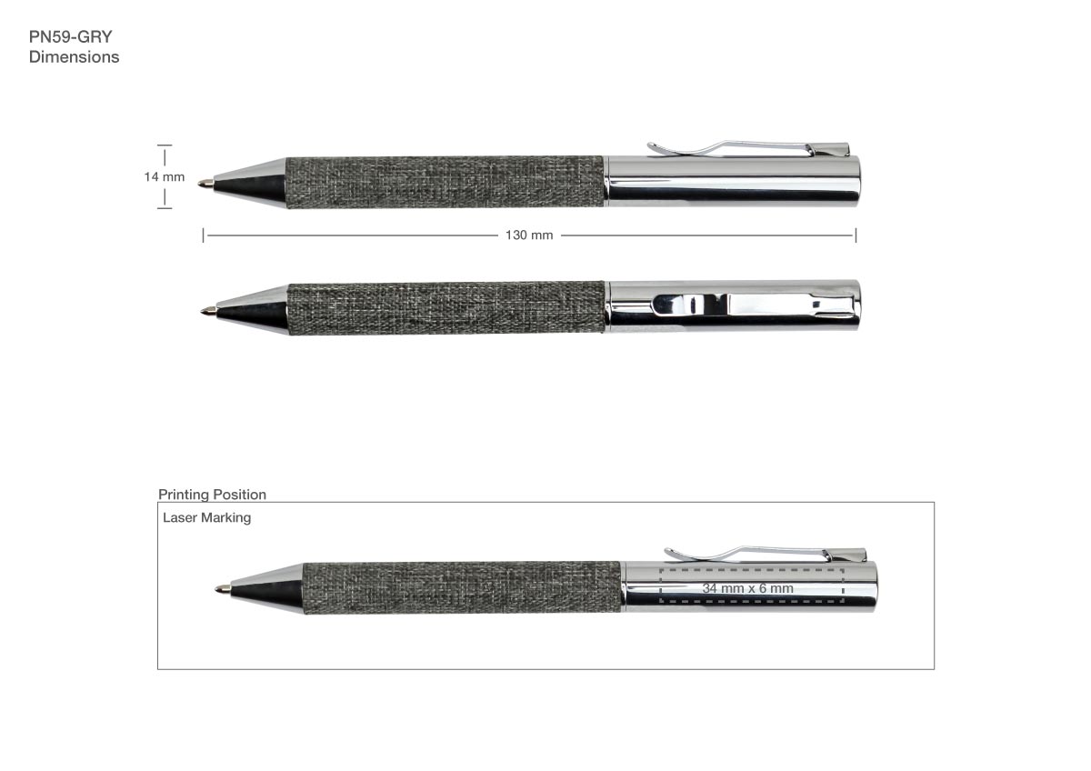 - RPET fabric-wrapped barrel with metal chrome cap, clip, and tip.