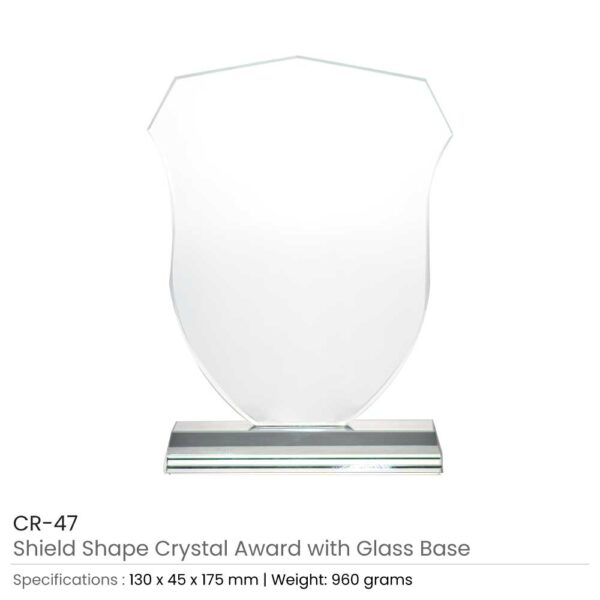 Shield Shaped Crystal awards with glass base packed in the black carton gift box.